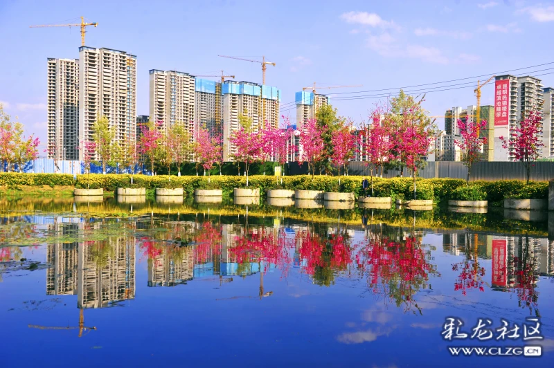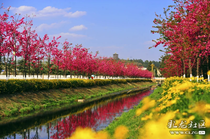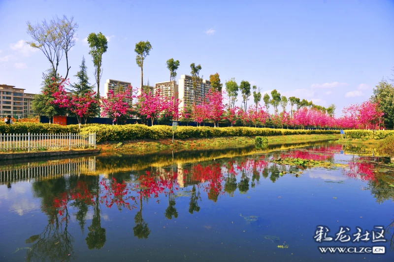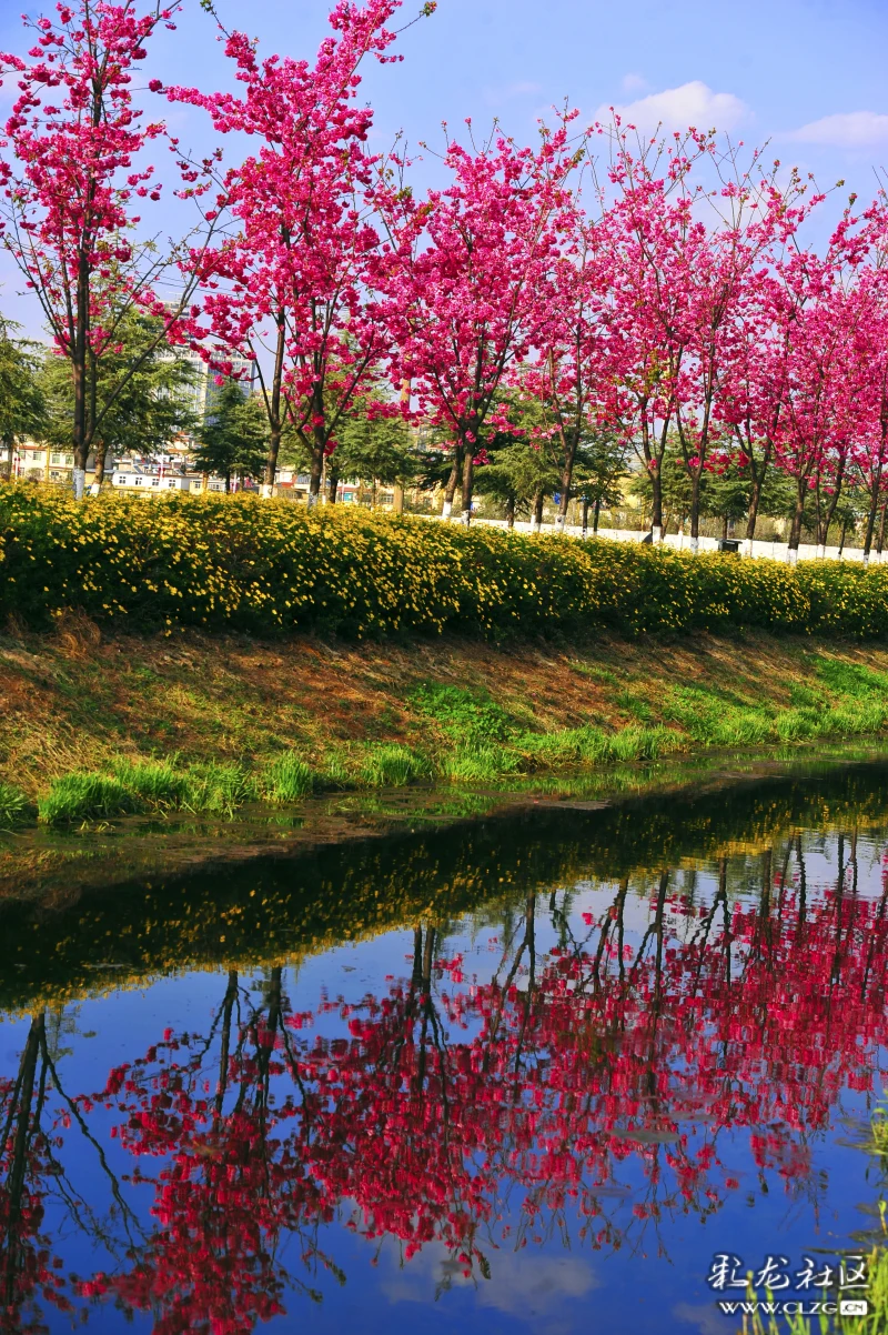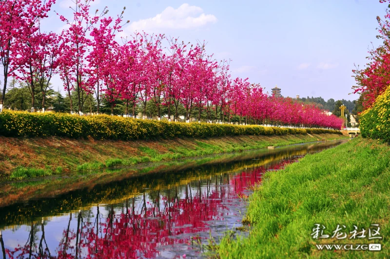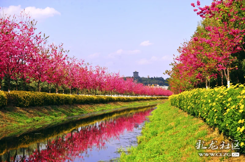 环湖东路斗南隧道口旁边的水龙沟河两岸的春樱花迎风绽放。河水清澈粉红色樱花的倒影清晰可见,抬头一望三台山公园的阁楼就在眼前。