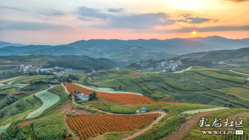 ດິນທີ່ພວມເກັບກ່ຽວເຂົ້າເປືອກສຸກ ແລະ ມັນຕົ້ນສະແດງໃຫ້ເຫັນດິນສີແດງສົດໃສ, ດອກເຣບຊິດສີຂາວ, ດອກດາວເຮືອງສີຄໍາ, ສາລີສີຂຽວ, ປ່າໄມ້ສີຂຽວ ແລະ ບ້ານທີ່ສວຍງາມ, ຮ່ວມປະກອບເປັນຮູບພາບລະດູໃບໄມ້ລົ່ນທີ່ສວຍງານຂອງດິນສີແດງຢູ່ເມືອງດົງຊວນ.
