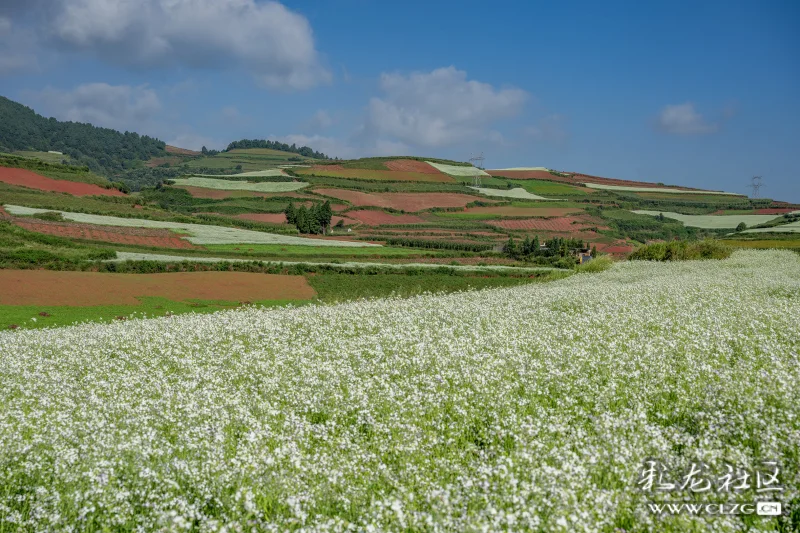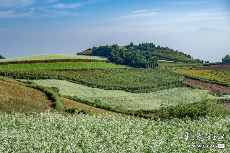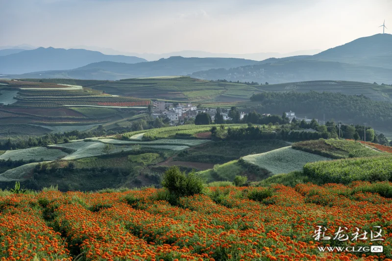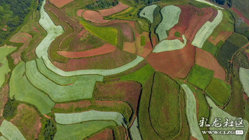 正在收获中的荞子和土豆地露出红艳艳的土壤,洁白的冬油菜花,金黄的万寿菊,翠绿的玉米,苍翠的森林,美丽的村庄,绘出了东川红土地壮美绚丽的秋景图。