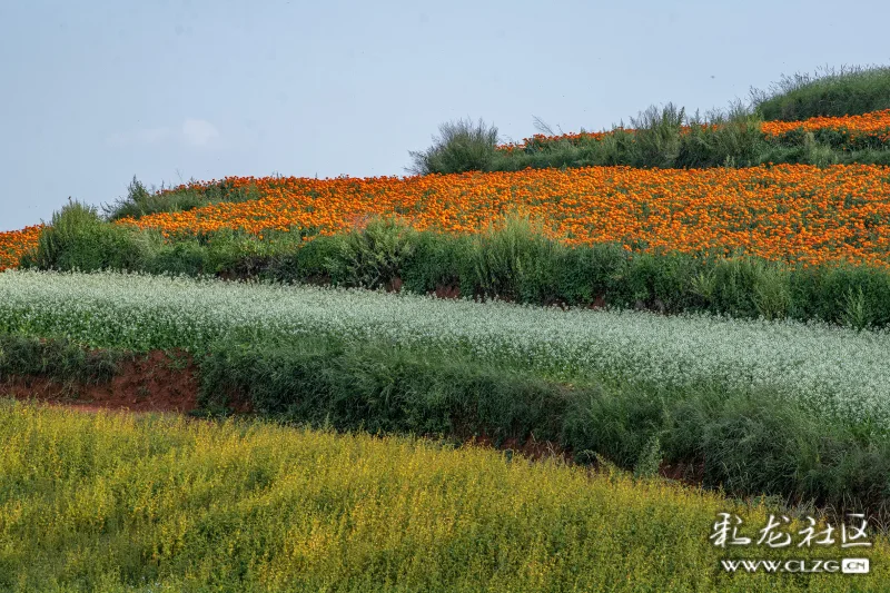 黄灿灿的成熟的荞子、盛开的洁白的冬油菜花,金黄的万寿菊。