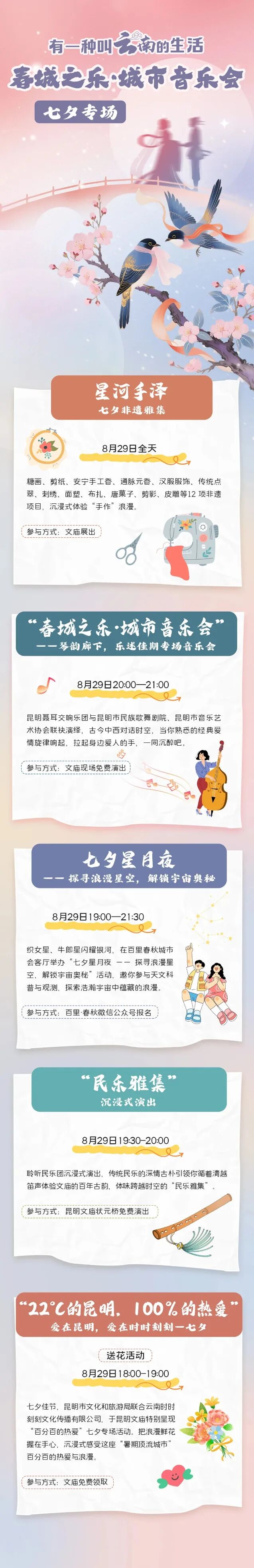 ຄວາມໂລແມນຕິກຂອງວັນແຫ່ງຄວາມຮັກຈີນແມ່ນແຍກບໍ່ອອກຈາກສຽງດົນຕີ.ເວລາ20:00ໂມງຂອງວັນທີ29ສິງຫາ(ບຸນຈີ່ສີ່),ງານຄອນເສີດພິເສດ"ບຸນຈີ່ສີ່"ຈະສະແດງຢູ່ວັດເວີນເມົາ.
