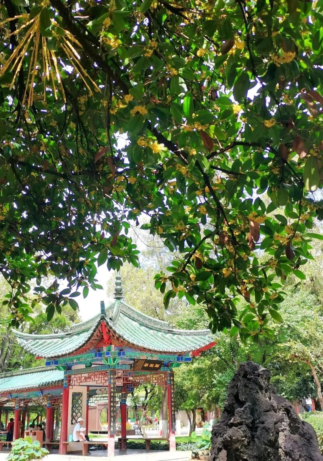昙华寺公园的桂香,最是特别,香气浓得化不开。后园大面积种植的桂花连成一片,像给舞台搭了层淡黄的幕布。这个秋天,就来昆明人的“后花园”昙华寺,闻桂花飘香吧。