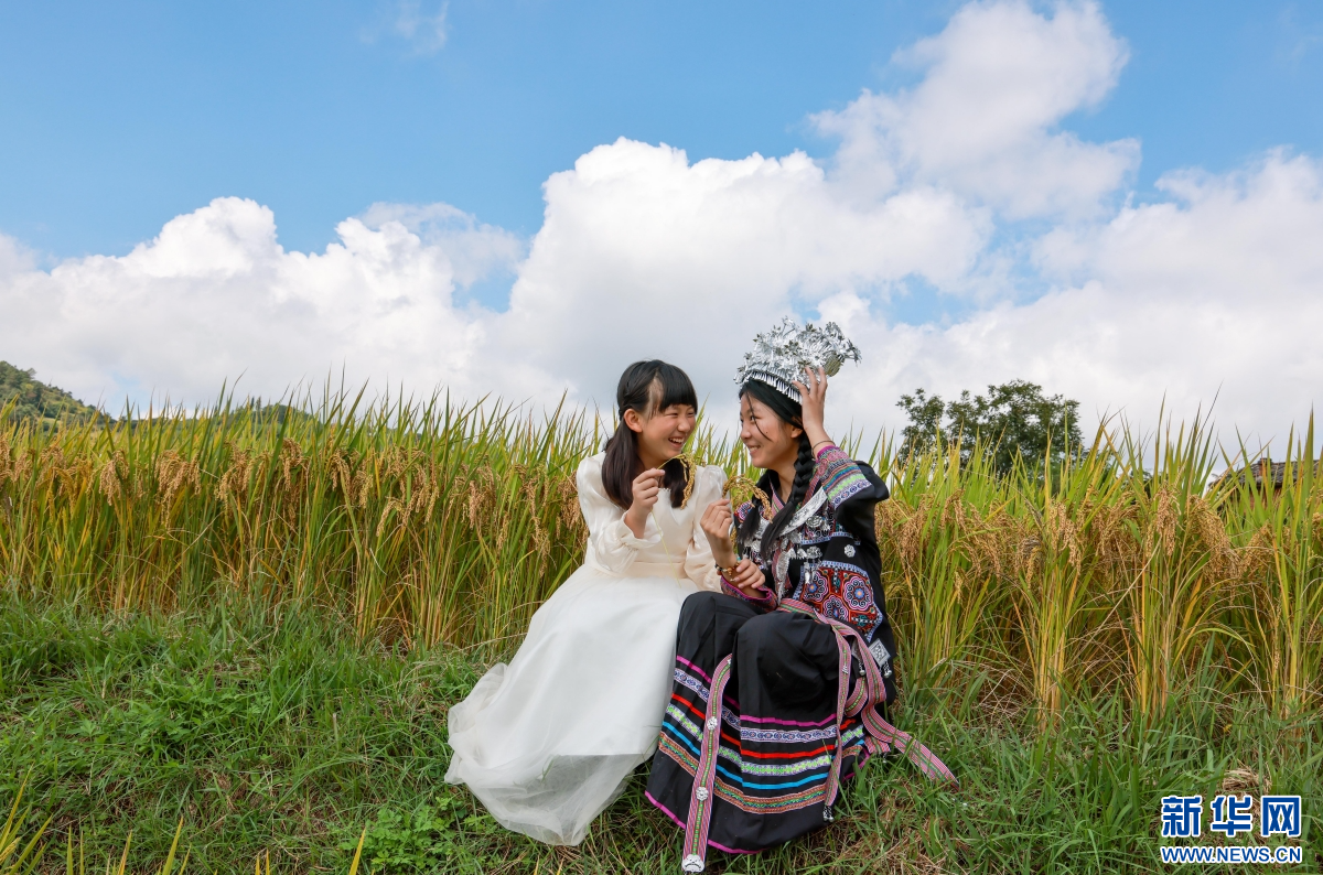 游客在稻田中游玩拍照(10月5日摄)。新华网发(孙文来 摄)