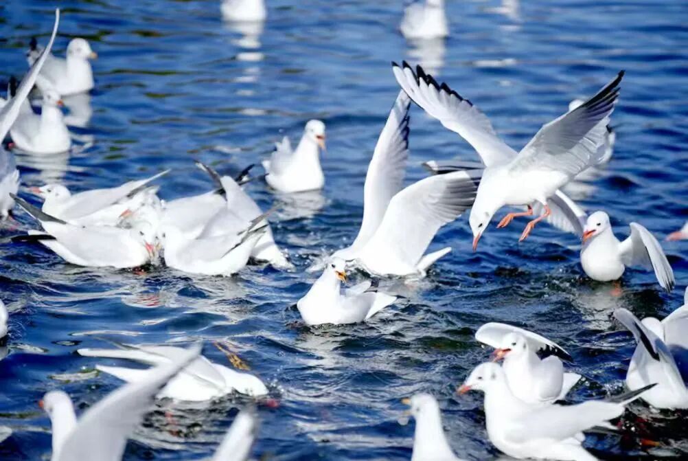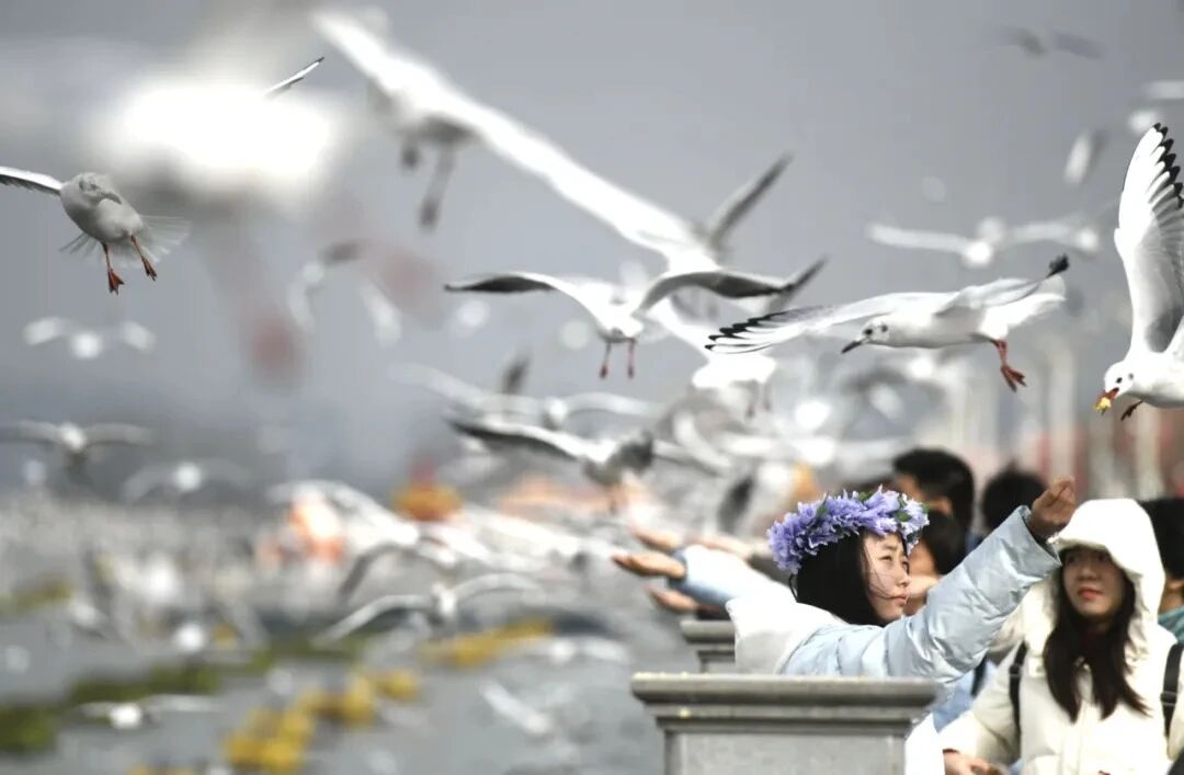上午,记者在海埂东码头看到,成群的红嘴鸥在水面上自由翱翔,它们时而在空中嬉戏打闹,时而飞临岸边,啄食游客手中的面包,现场洋溢着一片欢乐祥和的氛围。